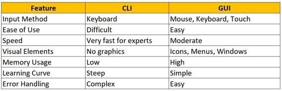 In CLI, the user must remember commands. There is no mouse support. Everything works through the keyboard. This type of interface is powerful but hard for beginners.